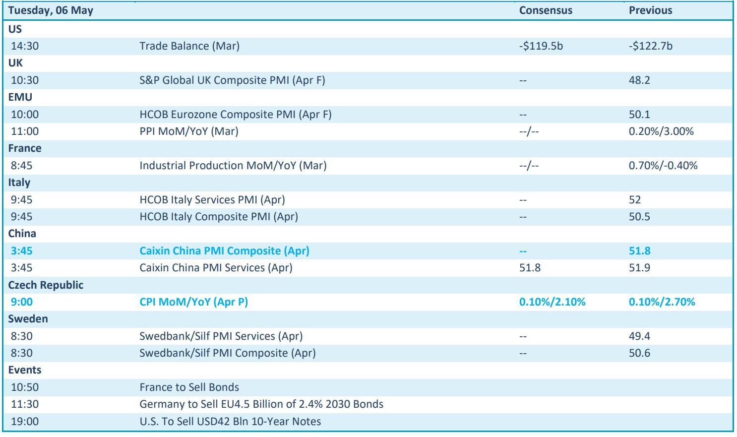 Op de economische kalender staat de publicatie van een hele nest sentimentsindicatoren centraal (komende van PMI, HCOB, Caixin en S&P Global). Die geven zoals altijd een betrouwbaar inzicht in de groeivooruitzichten voor de komende 6 maanden, dit keer voor het VK, EU, China en Zweden. Naast een inzicht in de Amerikaanse handelsbalans in maart, publiceert Europa en Tsjechië inflatiecijfers voor de consumenten- en producentenprijzen, terwijl Frankrijk de evolutie van de industriële productie in maart uitklaart.