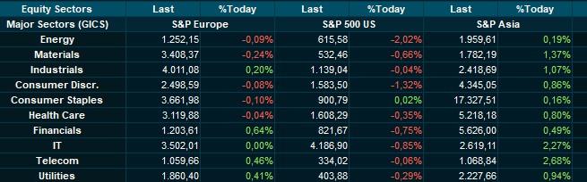 De Europese sectoren hielden het wat meer bescheiden, al gingen telecom (+0,5%), nutsbedrijven (+0,4%) en financials (+0,6%) wel met winst de dag uit.