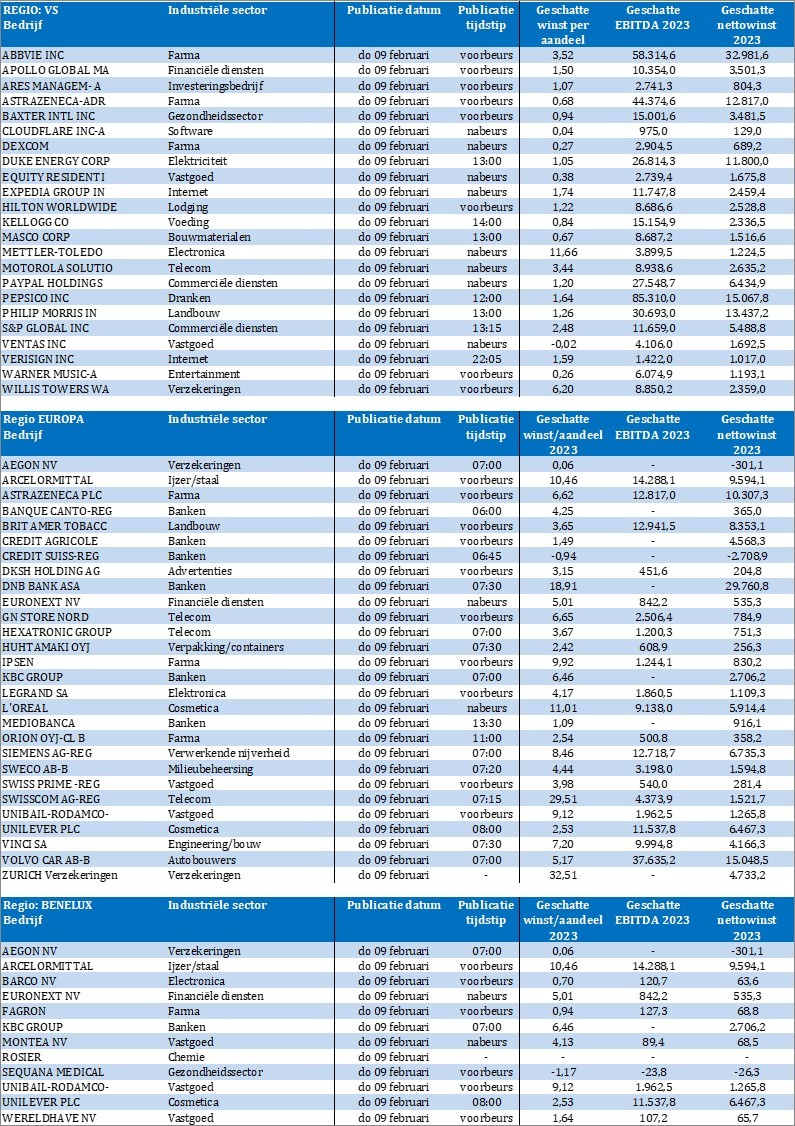 Dan is er héél wat meer animo op het vlak van de bedrijfsresultaten. We halen er enkele hoogtepunten uit: Cloudflare, Baxter, Astrazeneca, S&P Global, Pepsico, Kellogg, Expedia, Aegon, ArcelorMittal, Credit Agricole, KBC, L'oreal, Siemens, Barco, Euronext, Montea, Sequana Medical, Zurich Re, UnibailRodamco en véél, véél meer. Veel plezier!