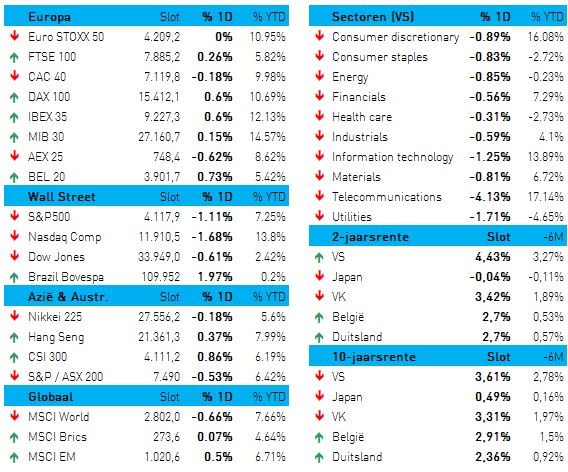 We kunnen wel stellen dat het optimisme na het banenrapport finaal verdwenen is. De Dow Jones verloor gisteren 100 punten, terwijl de S&P 500 en de Nasdaq 100 respectievelijk 0,6% en 1,2% verloren. In Europa kon de Euro Stoxx 600 (+0,27%) wel standhouden, maar of dat een lang leven beschoren zal zijn, is nog maar de vraag. De dollar trappelde gisteren ter plaatse (€1 = $1,0740), terwijl de 10-jaarsrentes ietwat daalden (Duitsland: 2,34%, VS: 3,61%). Opvallend genoeg steeg de Duitse 2-jaarsrente wel fors van 2,61%, naar 2,71%. Als we dat alles vertalen naar sectoren, zien we dat Wall Street over de hele lijn in het rood dook, met op kop IT-bedrijven, nutsbedrijven en de telecomsector.