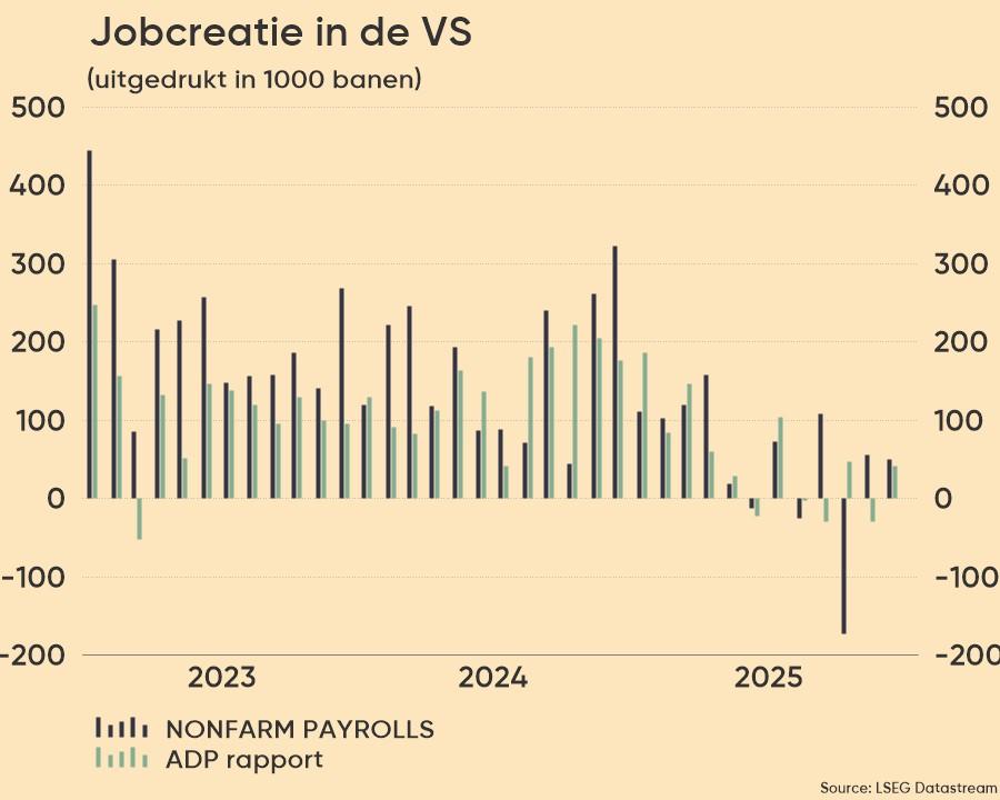 Die zwakte werd onderstreept door de publicatie van het ADP-banenrapport, want daaruit bleek dat de werkgelegenheid minder steeg dan verwacht. Het JOLTS-vacaturerapport schetste eveneens een beeld van vertragende groei, want het aantal vacatures lag een zucht onder verwachting