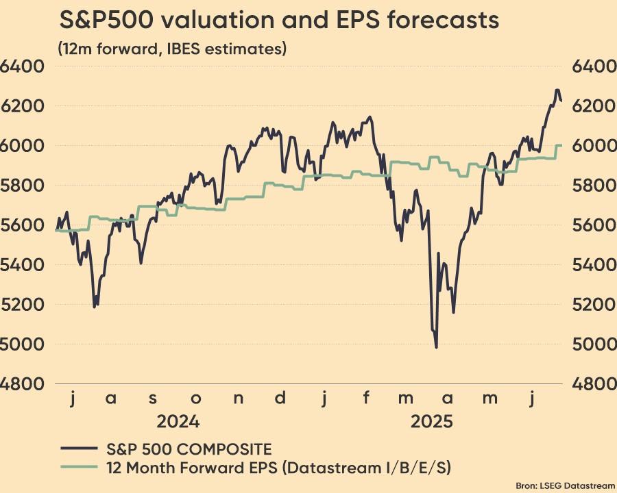 Maar ook spelen “veerkrachtige vooruitzichten voor de winstgroei in 2026 (de teller moet op 7% landen), de hervatting van de renteverlagingen door de Fed en de neutrale positionering van beleggers” een cruciale rol. Dat alles moet de huidige rally, die beperkt is in omvang, verbreden naar de hele markt, waardoor de waardering van de S&P500 van 20,4 naar 22 keer de winst kan aandikken.