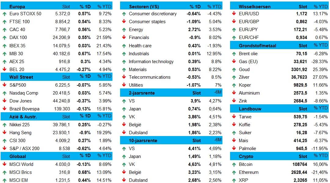 Ondanks de eindstand het niet zou doen vermoeden, werd het een redelijk bewogen dag. Er kwam nieuws uit alle kanten, en die stroom hield zich netjes in balans. Zowel de Europese (+0,4%) als de Amerikaanse aandelenindexen (+0,1%) eindigden de dag daardoor rond het nulpunt, terwijl de Amerikaanse dollar niet thuis gaf (€1 = $1,1735) en de goudprijs 0,2% lager werd gezet (3.292 dollar per ounce).
