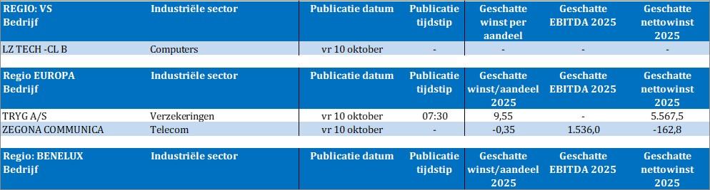 Bedrijfsresultaten krijgen we van LZ Tech, Tryg en Zegona Communication, maar zoals we gisteren al schreven start vanaf volgende week maanden het resultatenseizoen over het derde kwartaal. Aan het kanon staan dan al meteen een nest Amerikaanse grootbanken.