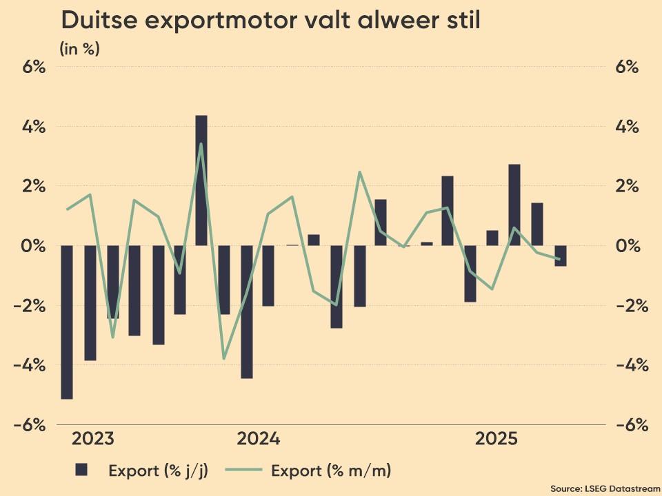 De Duitse export kromp in augustus 2025 met 0,5% op maandbasis tot het laagste punt in negen maanden, terwijl op 0,3% expansie werd gemikt. Dat volgt op een neerwaarts bijgestelde daling van 0,2% in juli, het gevolg van een daling van de vraag uit de Europese landen met 2,5%. Wel steeg de export naar niet-EU-landen met 2,2%, ondanks 2,5% minder export naar de VS. Die daling markeert ondertussen al de vijfde achtereenvolgende krimp op maandbasis, tot het laagste peil sinds november 2021.