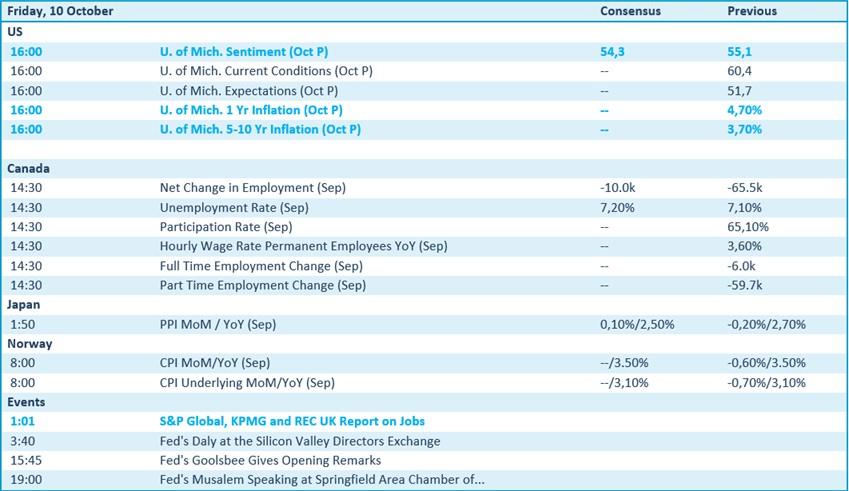 De economische kalender heeft niet erg veel om het lijf vandaag. We kijken uit naar de sentimentsindicator van de universiteit van Michigan over oktober, maar die geeft de markt normaal gezien wel info, maar niet noodzakelijk een ‘nieuwe richting’. Inflatiedata komt er uit Japan en Noorwegen, met respectievelijk inzicht in de producenten- en consumentenprijzen in september, terwijl het VK uitkijkt naar de publicatie van het Britse arbeidsmarktrapport van S&P Global, KPMG en REC.