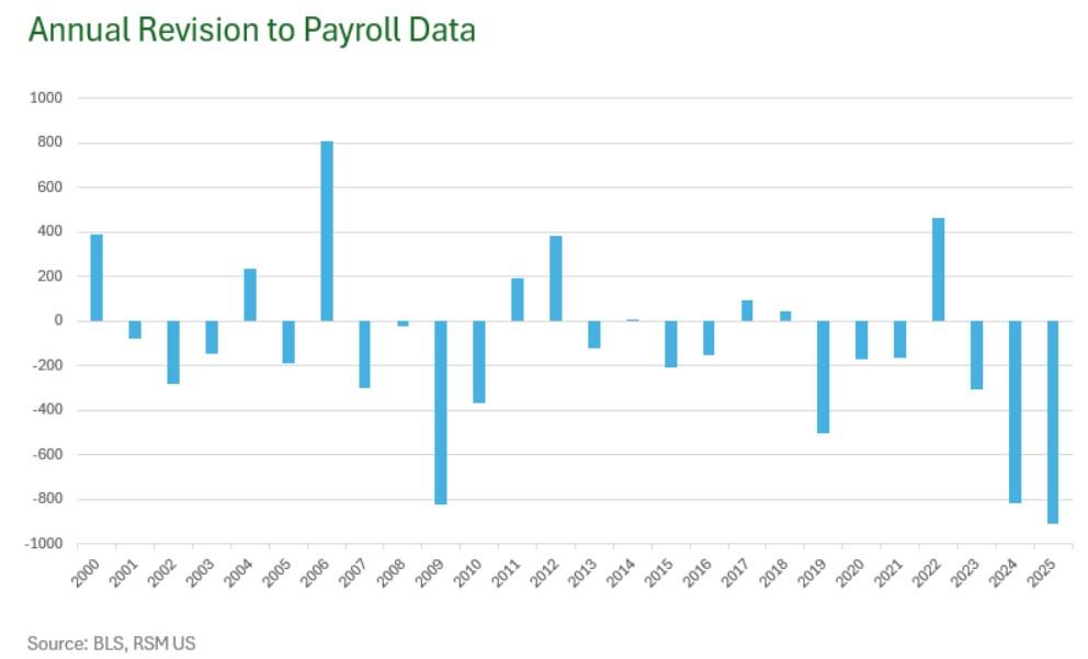 Bij wijze van uitsmijter komen we terug op het uitkijken, gisteren, naar de jaarlijkse herziening van de arbeidsdata door het Amerikaanse Bureau of Labour Statistics (BLS) voor de 12 maanden tot en met maart 2025. Een jaar eerder leverde dat al een bijstelling op met een duizelingwekkende 818.000 banen en voor de twaalf maanden blijken er liefst 911.000 minder banen bijgekomen dan wat eerder gecommuniceerd was.