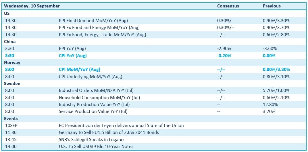Er staat vandaag een pak inflatienieuws op het menu en dat is iets waar de markten nog altijd naar uitkijken. De VS spant de kroon, met een inzicht in de evolutie van de producentenprijzen in augustus, gevolgd door de deflatiecijfers in China: de consumentenprijzen en de producentenprijzen zouden alweer gedaald moeten zijn. En ook Noorwegen levert zijn deel aan, via een update van de consumentenprijzen.