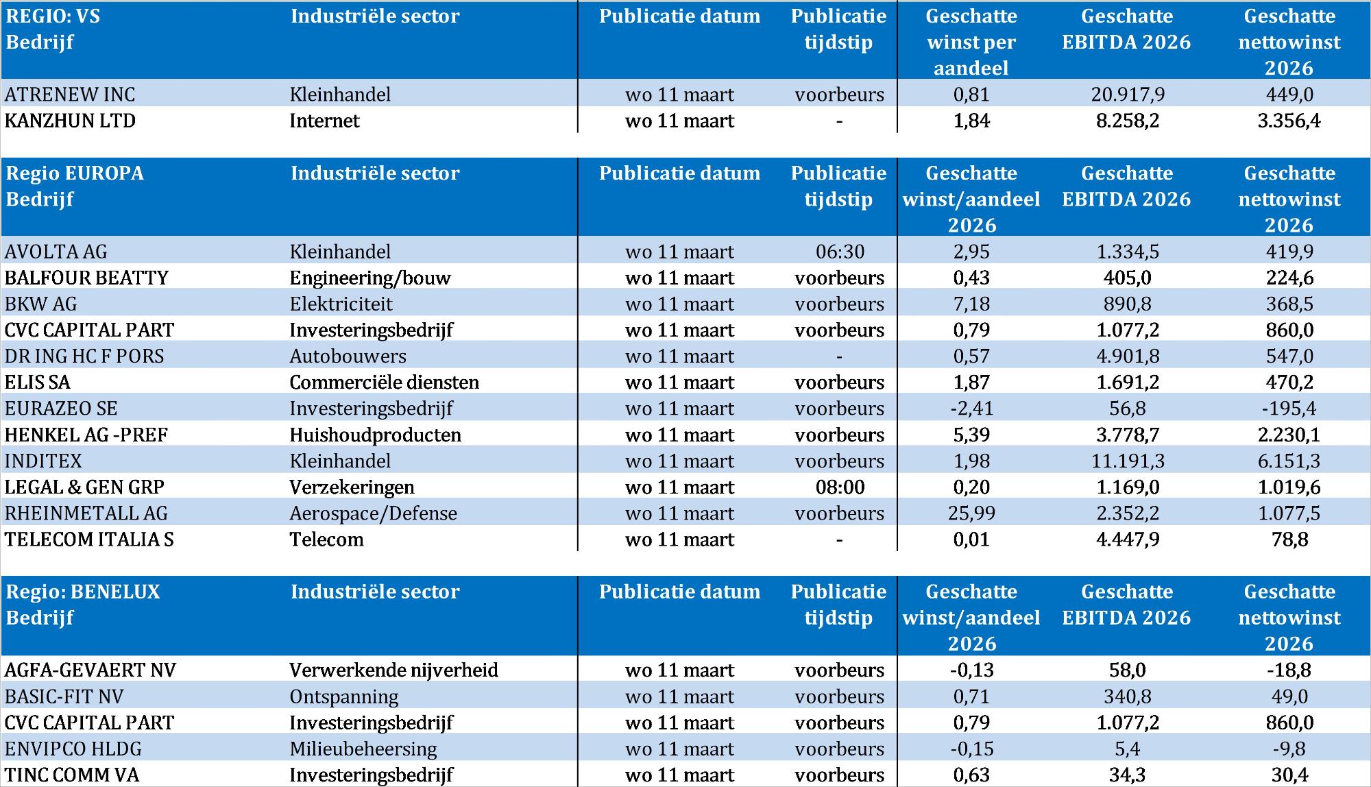 Bedrijfsresultaten komen er vandaag van Agfa‑Gevaert, Avolta, Balfour Beatty, Basic‑Fit, BKW, CVC Capital Partners, Dr. Ing. h.c. F. Porsche, Elis, Envipco, Eurazeo, Henkel, Inditex, Kanzhun, Legal & General, Rheinmetall, Telecom Italia en ATRenew.