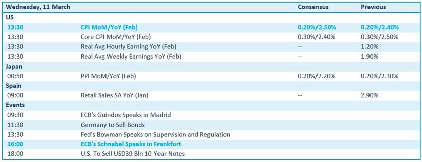 Op de economische kalender kijken we naar de consumenteninflatie in de VS, aangevuld met reële uur- en weeklonen. Dat moet richting geven aan de koopkracht. Ook Japan publiceert inflatie, via de producentenprijsindex, terwijl Spanje met kleinhandelsverkopen voor januari op de proppen komt. Verder houden wat directeurs van onder meer de ECB (Guindos, Schnabel) en de Fed (Bowman) zich onledig met speeches.
