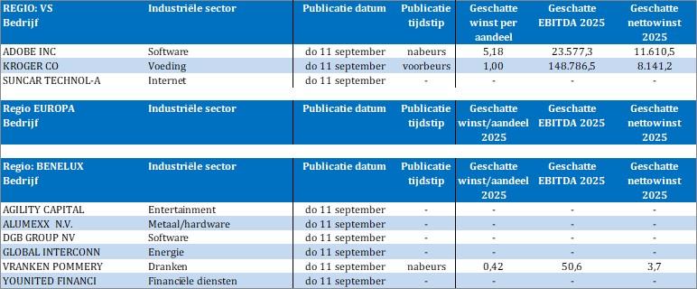 Bedrijfsresultaten komen er van Adobe, Kroger, SuncarTechnology, Agility Capital, DGB Group, Global Interconnection Group, Vranken Pommery en Younited Financial.