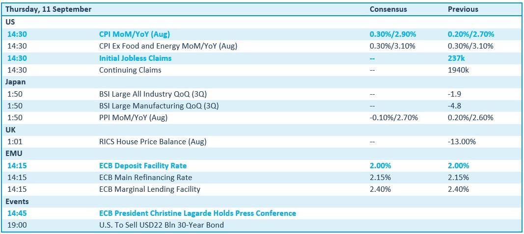 Hét cijfer van dag komt uit de VS: de consumenteninflatiedata over augustus zouden met 2,9% gestegen kunnen zijn op jaarbasis. Elke afwijking, of bevestiging, kan gevolgen hebben op heel wat vlakken! Verder kijken we uit naar het aantal nieuwe werkloosheidsaanvragen. Van elders in de wereld krijgen we inzicht in de Japanse producentenprijzen, de Britse huizenprijzen en natuurlijk – last but not least – de uitkomst van de ECB rentevergadering. Die zal naar verwachting niet morrelen aan de beleidsrente, maar toch.