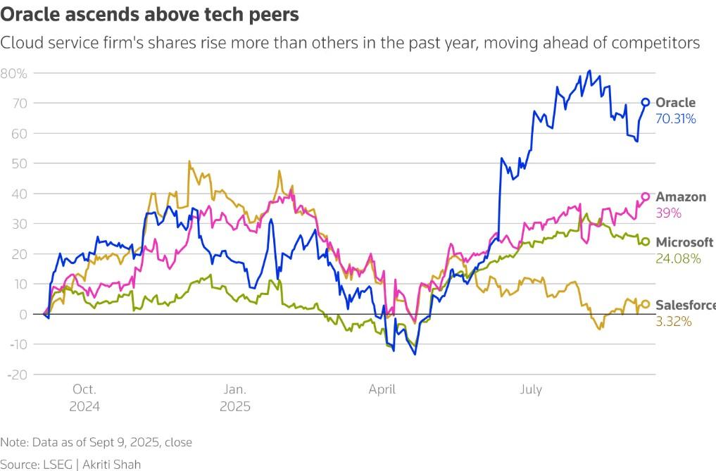 De échte schwung was zicht- en voelbaar op Wall Street, waar Oracle (+38%!) eigenhandig zorgde voor de grootste procentuele dagwinst sinds 1992, dankzij een forse stijging van de vraag van AI-bedrijven naar zijn clouddiensten. Logisch, dus, dat er prompt bijzonder veel aandacht ging naar de technologiebedrijven.