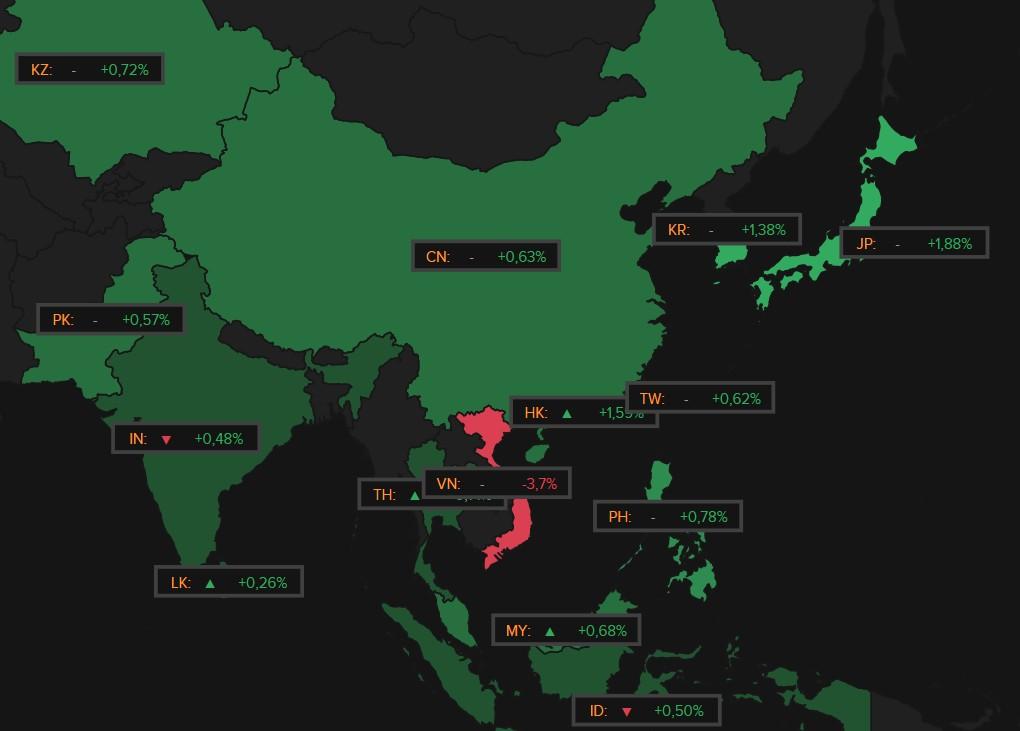 De Aziatische beurzen tonen vandaag een overwegend positief beeld, met Japan (+1,88%) en Zuid-Korea (+1,38%) als duidelijke winnaars. Hongkong volgt met +1,55%, terwijl China (+0,63%), Taiwan (+0,62%) en India (+0,48%) ietwat meer “bescheiden” stijgingen laten zien. Ook Zuidoost-Azië noteert licht groen: Maleisië (+0,68%), Indonesië (+0,50%) en de Filipijnen (+0,78%).