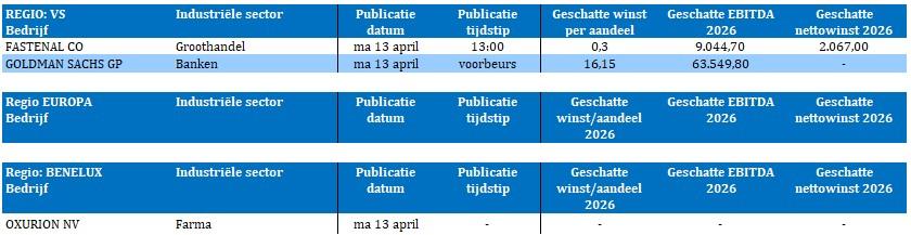 Het resultatenseizoen gaat vandaag officieel van start met Goldman Sachs; de focus zal liggen op de handelsinkomsten en de kredietcondities in een context van geopolitieke spanningen. Daarnaast wordt ook uitgekeken naar de omzetcijfers van LVMH en Christian Dior om een beeld te krijgen van de meest recente consumententrends.