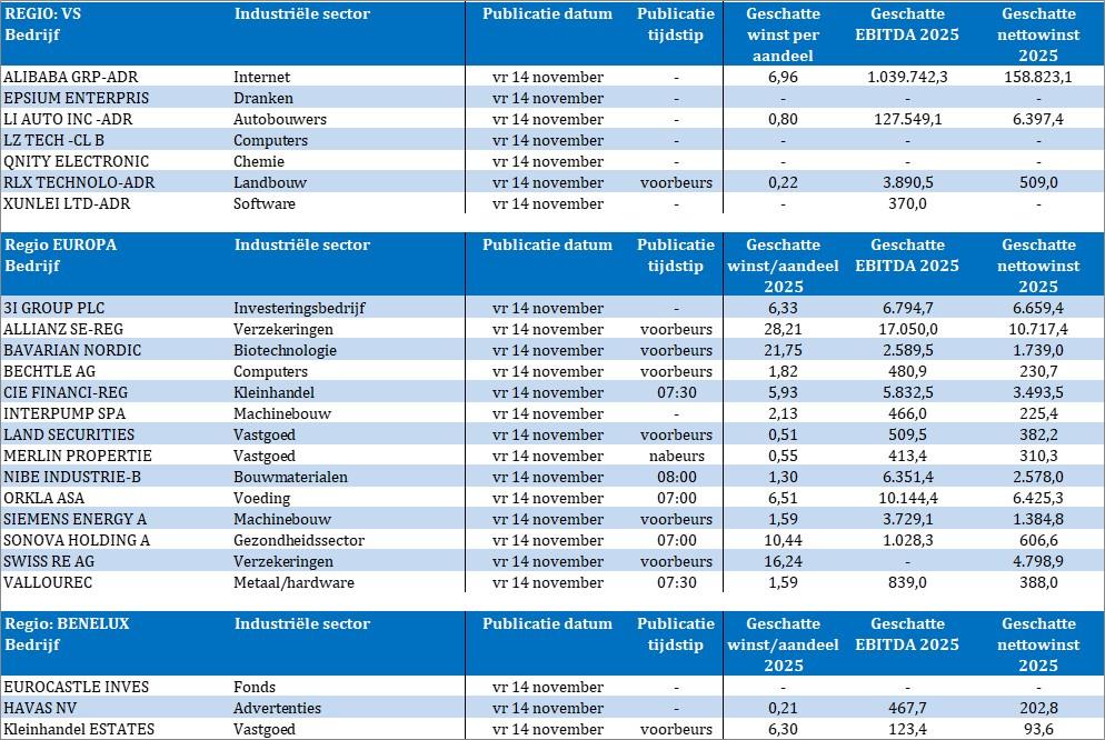 Bedrijfsresultaten komen er vandaag onder meer van 3i Group, Alibaba Group, Allianz, Bavarian Nordic, Bechtle, CIE Financiere, Eurocastle Investment, Epsilon Enterprises, Havas, Interpump, LA Auto, Land Securities, Merlin Properties, Nibe Industrier, Orkla, QNITY Electronic, RLX Technology, Siemens Energy, Sonae Holding, Swiss Re, Tech Club, Valourec en Xunlei.