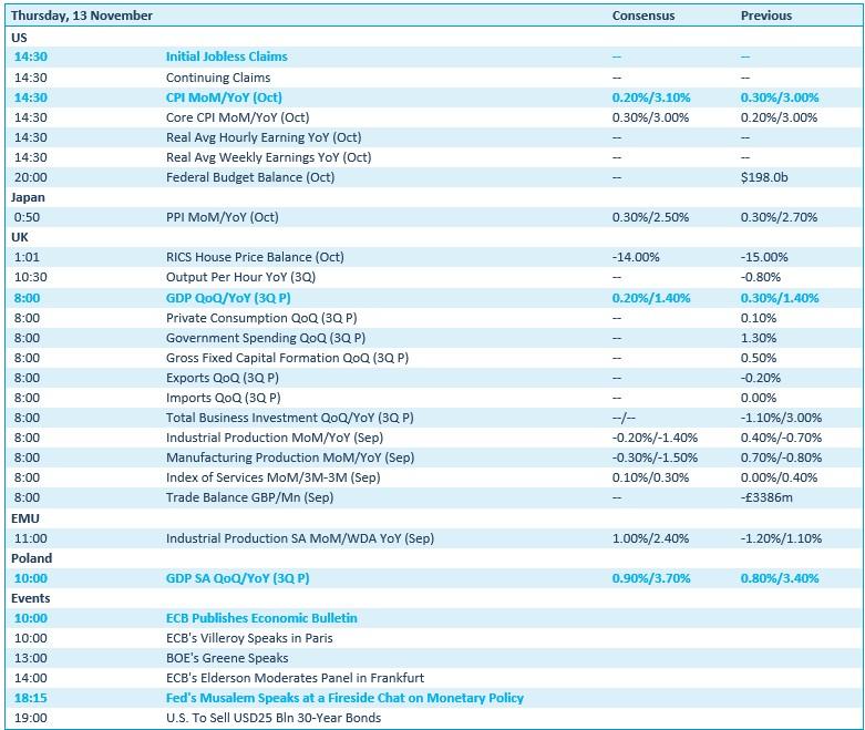 Vandaag staan er verschillende economische publicaties op de agenda. In de VS hadden we cijfers kunnen krigjen over de nieuwe werkloosheidsaanvragen en de inflatie (CPI) voor oktober, al zal de shutdown daar nog altijd een strategische stok voor steken. In Japan wordt de producentenprijsinflatie (PPI) voor oktober bekendgemaakt. Het VK en Polen publiceren het BBP voor het derde kwartaal, samen met de import- en exportcijfers. Daarnaast verschijnen in zowel de EU als het VK de cijfers over de industriële productie voor september. Tot slot, en dat levert zeker interessant leesvoer op, brengt de ECB haar nieuwste Economic Bulletin uit.