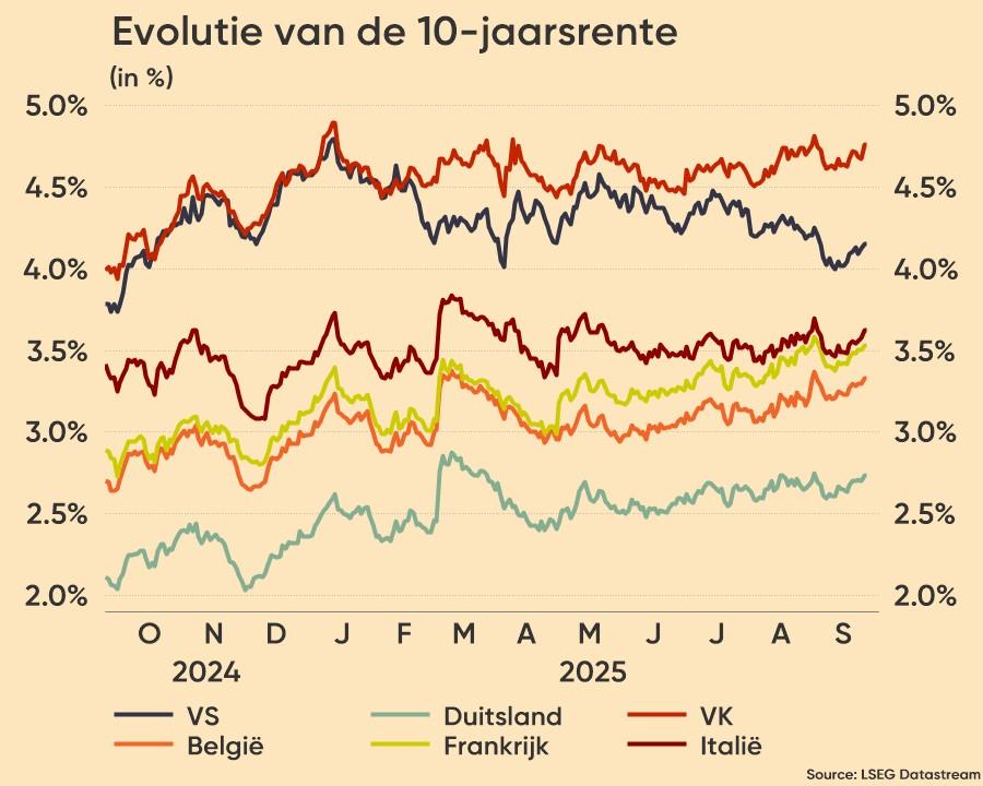 Bon, vrijdag deed plots wat denken aan het “Liberation Day”-moment van 2 april. Plots onweer, dat iedereen onder de paraplu jaagt. En dat komt bovenop de Franse én Japanse politieke onrust, terwijl de VS nog altijd in ‘shutdown’ is. De veilige havens waren en zijn logischerwijs nog meer in trek, omdat beleggers dan toch nog eens wat risico-avers blijken te kunnen worden. Die “strategische terugtrekking” ondersteunde de dollar (€1 = $1,1621), maar vooral de prijs van overheidsobligaties. Zowel de korte als de lange termijn rentes in de VS en Europa namen een duik, tot 4,05% en 2,64% in de VS en Duitsland op 10 jaar.
