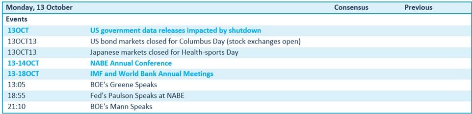 Op de economische kalender valt weinig informatie te vinden, onder meer omdat de Amerikaanse data door de shutdown niet worden vrijgegeven. Verder is het ook Columbus Day, waardoor de obligatiemarkten het slot op de grendel houden. Ook Japan heeft een dagje vakantie voor Health Sports Day, maar gelukkig redt het IMF de meubelen met een World Bank annual meeting.
