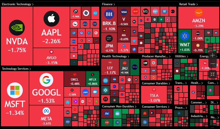 Op Wall Street werden winsten in de technologiesector in sneltempo vastgeklikt, wat de S&P 500 technologie-subindex 4% lager duwde en 6% van de overkoepelende index van halfgeleiders afschaafde. Verder ook verliezen voor Chinese bedrijven zoals Alibaba Group (-8,4%) en JD.com (-6,2%). En die dalingen zetten zich vannacht door in Azië, waar de aandelen ook naar dekking zochten. Azië noteert duidelijk in het rood: Zuid-Korea -0,7%, Taiwan -1,4%, Hongkong -2,3%, China -0,7% en India -0,4%.