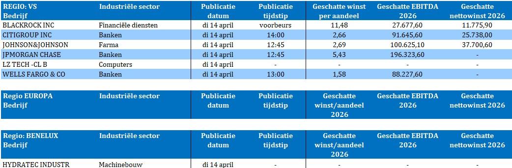 Op het vlak van resultaten markeert vandaag de officiële start van een reeks zwaargewichten: JPMorgan, Wells Fargo, Citigroup en BlackRock publiceren cijfers, net als onder meer Johnson & Johnson. Bij de banken zal de aandacht vooral uitgaan naar de vooruitzichten en commentaar over kredietkwaliteit (consumentenstress, financieringskosten, toon in trading en investment banking), eerder dan naar het achterliggende kwartaal. Daarnaast zullen we scherp letten op opmerkingen over private credit.