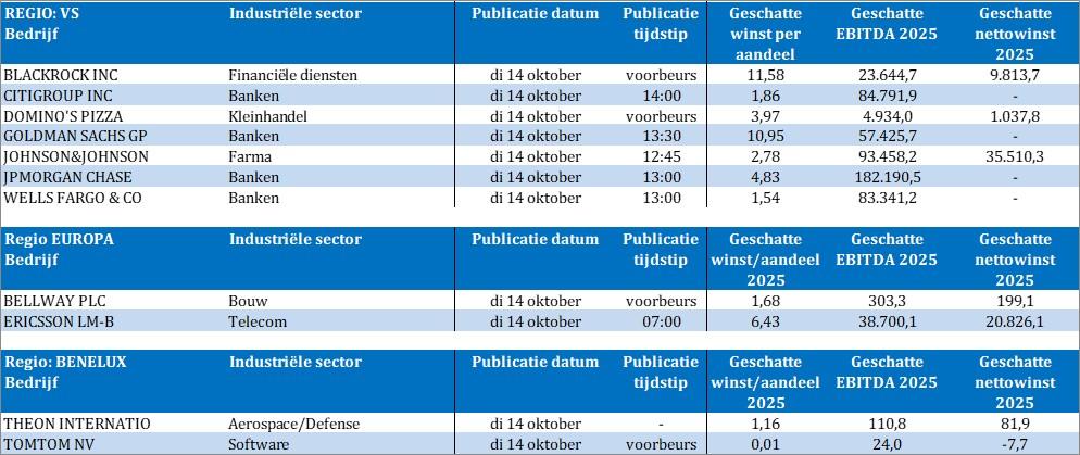 Qua bedrijfsresultaten begint het derde kwartaalseizoen en dat zorgt traditioneel voor heel wat vuurwerk. Vraag is natuurlijk of dat in de lucht, of op het land, zal landen, maar afgaande op de analisten ziet het er redelijk goed uit. Aan het kanon staan vandaag BlackRock, Citigroup, Domino’s Pizza, Goldman Sachs, Johnson & Johnson, JP Morgan Chase, Wells Fargo, Bellway, Ericsson en TomTom. Smullen maar.