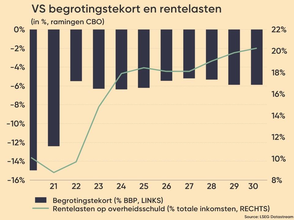 Het onafhankelijke Congressional Budget Office, zeg maar het Rekenhof van de VS, voorspelt een reële BBP-groei van 1,8 à 2,0% per jaar tot 2028. Het tempo wordt afgezwakt door tarieven, een strenger monetair beleid en demografische beperkingen, waarbij de werkloosheid kan stijgen tot 4,5 à 5,0% in 2028. De inflatie moet pieken tussen 2,4 à 2,6% in 2025-2026 om nadien te dalen tot 2,0 à 2,2%.