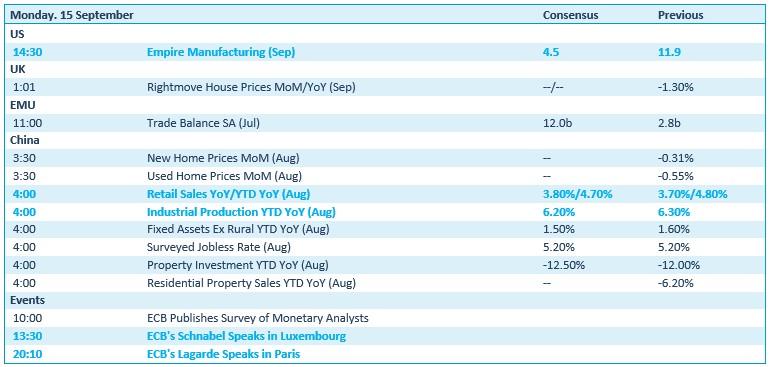Tegenover die spanningsboog heeft de economische kalender vandaag weinig om het lijf, met uitzondering van de hierboven al becommentariërende Chinese kleinhandelsdata. We kijken uit naar de Amerikaanse empire manufacturing index voor september, de Britse huizenprijzen en de Europese handelsbalans. Maar écht richtinggevend zijn die data niet, en dat kunnen we ook niet verwachten van de speeches van zowel Lagarde als Schnabel, beide op de loonlijst van de ECB.