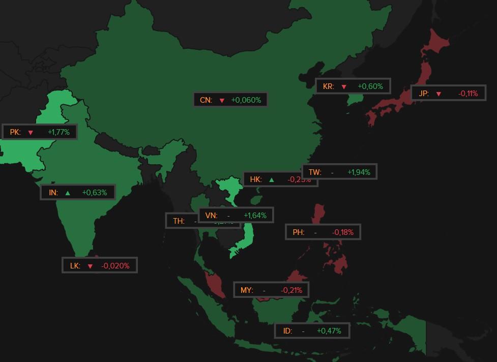 Wall Street zette die positieve trend gisterenavond voort, met 0,25% winst voor de S&P 500 en de Nasdaq, terwijl vannacht ook de Aziatische trein netjes op de rail bleef. Taiwan (+2%), Vietnam (+1,7%) en Zuid-Korea (+0,6%) kleuren frisgroen, met China op status quo. Aan de basis ligt AI-optimisme, in het zog – natuurlijk – van de solide 4Q-cijfers van TSMC. Maar er werd ook een handelsakkoord gesloten tussen de VS en Taiwan. Dat moet lagere invoertarieven op Taiwanese chipexporten én extra investeringen in de Amerikaanse techsector opleveren.