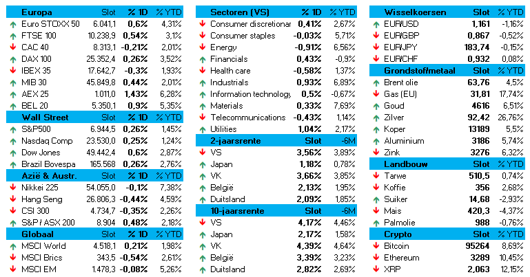 Europese aandelen klokten alweer op recordhoogte af, gegangmaakt door solide bedrijfsresultaten. Interessant genoeg zorgde dat vooral voor een revival van de technologie- (+1,8%) en financiële aandelen (+1,3%), ondanks beide eergisteren nog door het stof moesten. Wispelturige beleggers, en op hol slaande algoritmes zorgen wel meer voor ruis, maar deze beweging is toch opmvallend. We nomineren “ongewenste volatiliteit” als nieuw financieel buzzword (ook al bewogen de goudprijs (4.609 dollar/ounce) en de Bitcoin (95.506 dollar) niet).