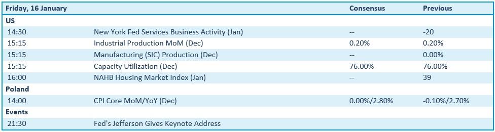 Vandaag kijken we naar een reeks Amerikaanse cijfers, waaronder de New York Fed Services Business Activity voor januari, industriële productie en manufacturing voor december, de capaciteitsbenutting en de NAHB-huismarktindex. Ook spreekt Fed's Jefferson later op de dag. Vanuit Polen komt de kerninflatie voor december.