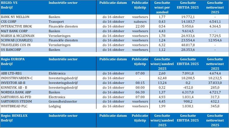 Bedrijfsresultaten komen er vandaag van Bank NY Mellon, CSX, Interactive Brokers, M&T Bank, Marsh & McLennan, Charles Schwab, Travelers Cos, US Bancorp, ABB, Industrivarden, Investor, Kinnevik, Nordea Bank, Sartorius, Sartorius Stedim en Whitbread.
