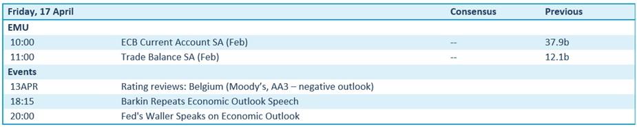 De economische agenda is vandaag beperkt. In de Verenigde Staten staat de Leading Index van de Conference Board op de kalender. In Europa gaat de aandacht uit naar externe en balansgegevens, zoals de lopende rekening en de handelsbalans van de eurozone. Wat bedrijfsresultaten betreft krijgen we cijfers over het eerste kwartaal van enkele regionale banken en industriële bedrijven; grote, door winstcijfers gedreven marktbewegingen worden niet verwacht.