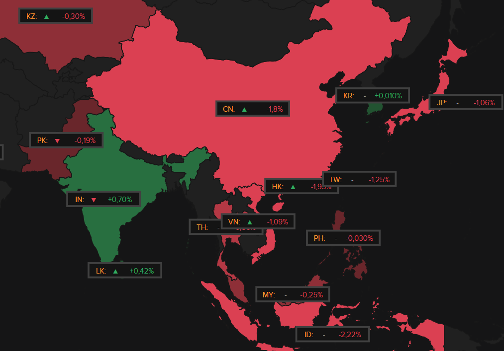 Beursverliezen waren er ook in Azië, waar de lentefrisse kleuren van gisteren quasi integraal omgezet worden in Satanisch Rood. China (-1,8%), Hongkong (-1,9%), Taiwan (-1,2%), Japan (-1,1%) zetten de toon, waaraan enkel India (+0,7%) en Zuid-Korea (+0,1%) kunnen ontsnappen.