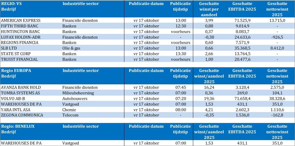 Bedrijfsresultaten krijgen we vandaag onder meer van American Express, Fifth Third Bancorp, Huntington Banc, LufaxHolding, Regions Financial, SLB, State Street, Truist Financial, Avanza Bank, Tomra Systems, Volvo, WDP, Yara en Zegona Communications.
