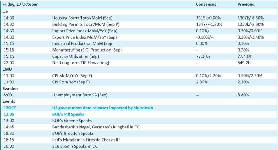 Op de economische kalender is het ook vandaag weer blind vliegen, tenminste in de VS. De shutdown verhinderd de opmaak en de publicatie van data. Enfin, we zullen wel zien welke cijfers er eventueel door komen. Wel zeker is dat er finale Europese inflatiecijfers aankomen, die naar schatting een stijging met 2,2% op jaarbasis kunnen uitwijzen. Verder geeft Zweden inzicht in de werkloosheidsgraad, terwijl onder meer Bank of England topman Huw Pill een speech mag afsteken.