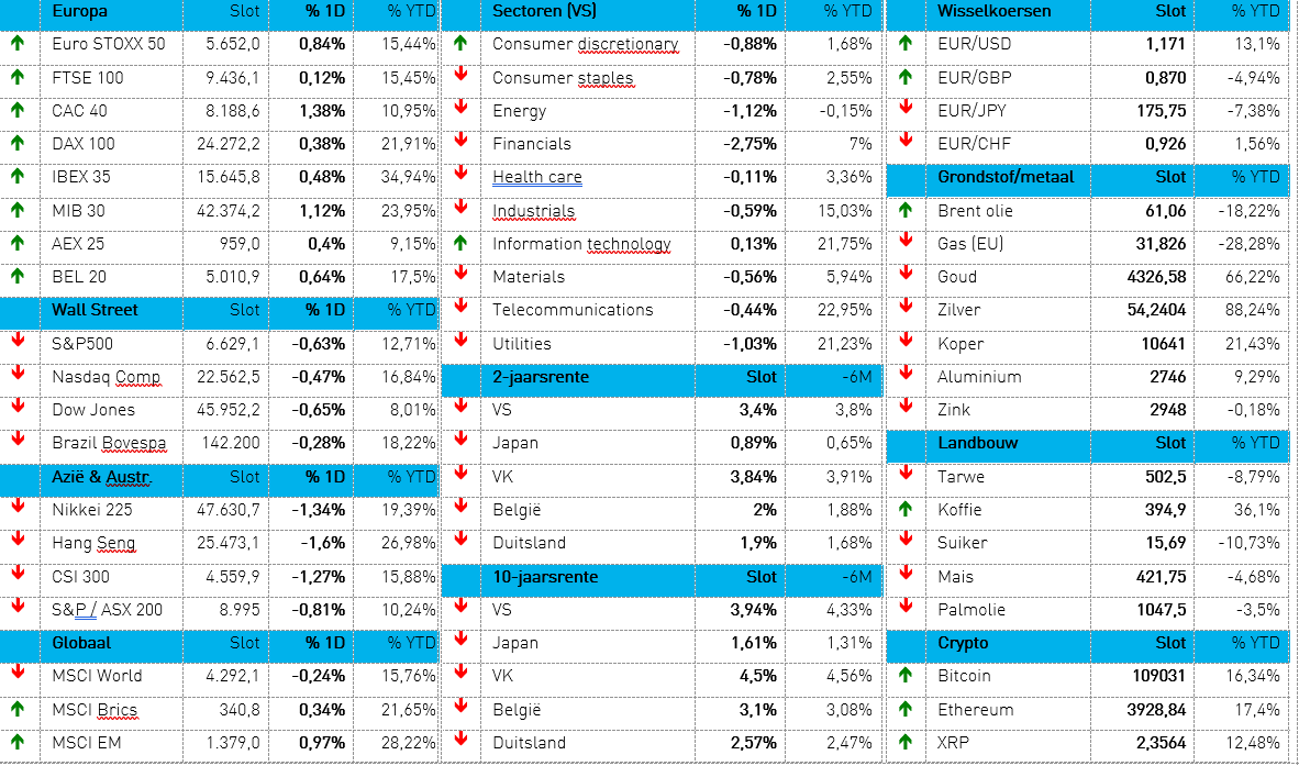 Aan de basis ligt heel wat, maar boven al het geloof dat Trump veel lawaai maakt, maar veel minder hard bijt. Zeker tegen China. Ook speelt het aanhoudende AI-optimisme een belangrijke rol, terwijl gisteren ook de fragiele Franse regering een cruciale vertrouwensstemming overleefde. De Europese obligaties hielden hun recente winst moeiteloos vast, waardoor de 10-jaarsrentes de hele dag stabiel bleven en pas laat op de dag verder door de knieën gingen: de Duitse 10-jaarsrente daalde 5 basispunten tot 2,53%, terwijl de Amerikaanse variant 3 punten daalde tot 3,94%.