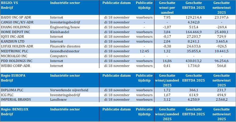 Bedrijfsresultaten komen er van Baidu, Cango, Diploma, EHang Holdings, Home Depot, ICG, Imperial Brands, iQIYI, Kanzhun, Lufax Holding, Medtronic, MicroAlgo, PDD Holdings en Weibo.