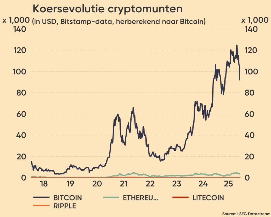 Ook andere munten zoals ethereum (-6% tot 2,988.29 dollar), Solana (-4%) en XRP (-5%) kenden een baaldag, zodat alle crypto-winsten sinds de verkiezing van Trump ondertussen de deur uitgingen. De totale marktwaarde van de cryptomunten bedraagt vandaag nog 3,07 biljoen dollar, terwijl dat op de piek iets meer dan 5 biljoen was.