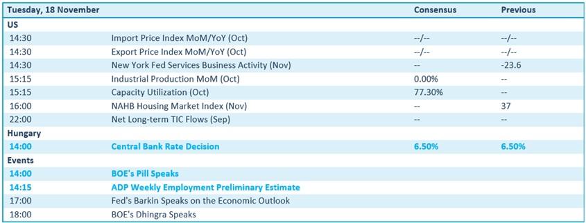 Er staat weinig economisch nieuws op het menu. In de VS krijgen we de import- en exportprijsindex voor oktober, de New York Fed Services Business Activity voor november en de industriële productie en capaciteitsbenutting voor oktober. Daarnaast is er ook een update van de NAHB huizenmarktindex. Hongarije beslist ondertussen over de beleidsrente, en dat wordt geflankeerd door toespraken van BOE’s Pill en Dhingra, en een toespraak van Fed’s Barkin over de economische vooruitzichten