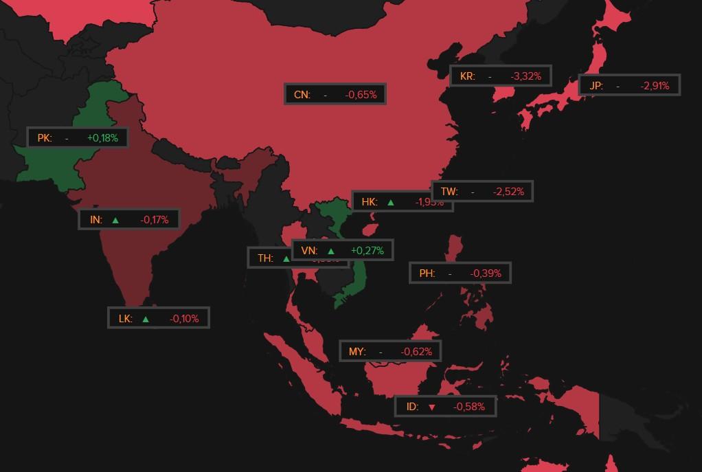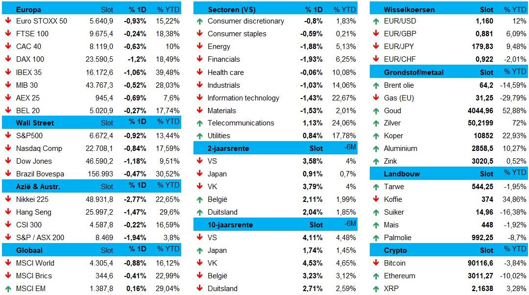 Eens te meer lag de technologiesector aan de basis van roodgekleurde aandelenmarkten, en dat in afwachting van enkel belangrijke economische publicaties deze week, zoals de kwartaalcijfers van AI-moloch Nvidia (-1,9%) en het banenrapport van september. De Euro Stoxx 600 werd 0,5% lager gezet, de Dow Jones verloor 1,5%, met verliezen in het geliefde AI-segment, maar ook voor bedrijven zoals Salesforce en Apple. De S&P 500 liet ook 1,4% liggen, terwijl de Nasdaq 1,5% lager werd gezet. In Azië daalde de Shanghai Composite met 0,46% naar 3.972 punten, naast een verlies met 1,1% voor de CSI 300. De Hang Seng in Hongkong verloor 0,9%, terwijl Zuid-Korea 3% onderuit ging en Japan 2,9% verloor.