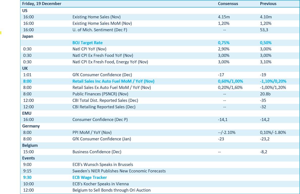 In de Verenigde Staten komen cijfers over bestaande woningverkopen (nov) en het sentiment van de Universiteit van Michigan (dec). Japan publiceert de BOJ‑beleidsrente en CPI‑cijfers (nov). In het Verenigd Koninkrijk volgen consumentenvertrouwen (dec), detailhandelsverkopen (nov) en overheidsfinanciën. De eurozone brengt consumentenvertrouwen (dec). Duitsland publiceert producentenprijzen (nov) en GfK‑consumentenvertrouwen (jan). België meldt zakelijk vertrouwen (dec). Zweden presenteert nieuwe economische vooruitzichten. Daarnaast zijn er ECB‑evenementen en een Belgische obligatieveiling.