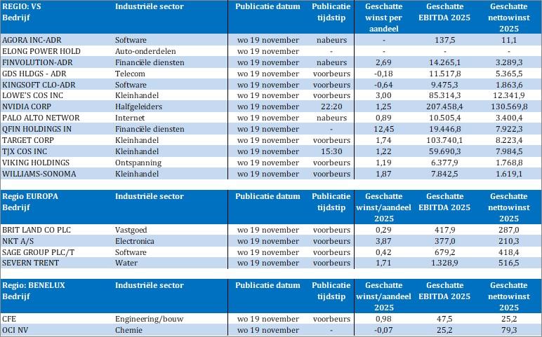 Qua bedrijfsresultaten kijken we natuurlijk met een heel veel belangstelling uit naar de kwartaalupdate van AI-goeroe Nvidia. En dat wachten wordt opgeleukt met onder meer Agora, British Land, CFE, Elong Power Hold, Finvolution, GDS Holdings, Kingsoft Cloud, Lowe's, NKT, OCI, Palo Alto Networks, QFIN Holdings, Sage Group, Severn Trent, Target, TJX, Viking Holdings en Williams Sonoma.