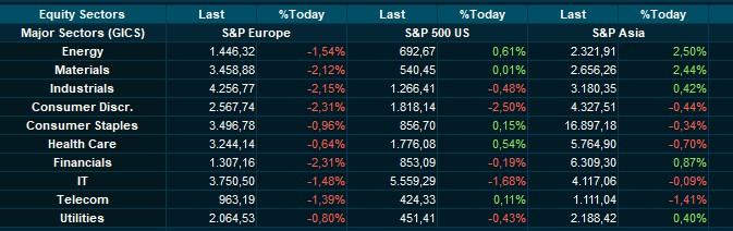Niettemin is dat Europese verlies van gisteren best opvallend, omdat men redelijkerwijs zou mogen verwachten dat er vooral winst zou worden genomen op de ogenschijnlijk ‘duurdere techbedrijven’ (ook al zijn die niet zoveel duurder als je de totale waardering bekijkt). Maar goed, waar ik naar toe wil is een volledig rood koersenbord op sectorniveau, met 2% verlies of meer voor grondstoffen, industrials, consumentenbedrijven en financials. In de VS noteert slechts de helft van de sectoren op verlies, terwijl er in Azië zelfs meer winnaars dan verliezers zijn. Misschien is de verklaring wel te vinden in de liquiditeit van de onderliggende aandelen, iets waar Europa van oudsher zwakker op scoort.
