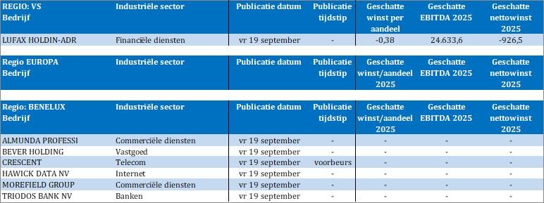 Bedrijfsresultaten komen er onder meer van de Lufax Holding, Almunda Professional, Bever Holding, Crescent, Hawick Data, Morefield en de Triodos Bank.