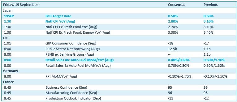 Qua economisch nieuws vervolgt het rentecircus vandaag zijn wereldtournee, omdat de Japanse centrale bank over de beleidsrente besliste. Dichter bij huis kijken we uit naar de Britse kleinhandelsverkoop en – mogelijk belangrijker – het consumentenvertrouwen in september. Duitsland zat daar de evolutie van de producentenprijzen tegenover, terwijl Frankrijk zijn plaats op de kalender opeist met een update van het zakelijke vertrouwen in september. Geen van deze cijfers weegt echter voldoende zwaar om écht de stempel op de handelsdag te kunnen duwen.