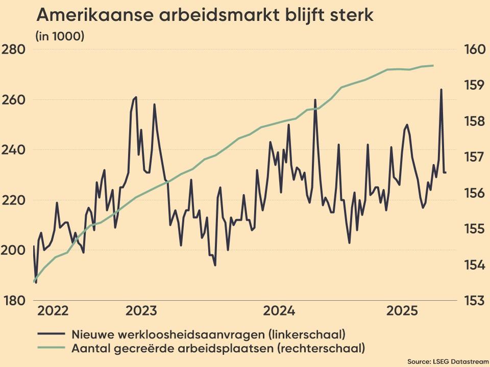 Op de obligatiemarkt werd gepauzeerd. De 10-jaarsrente steeg in de VS met drie basispunten naar 4,1%, na eerder even onder 4% te hebben gedoken, omdat de Federal Reserve zich eerder voorzichtig dan agressief uitliet over het monetaire beleid in de komende kwartalen. Tel daarbij een sterke update van de Philadelphia Fed index gisteren (voor de verwerkende nijverheid) en een onverwacht laag aantal nieuwe werkloosheidsaanvragen en het is duidelijk waarom de Fed niet alle sluizen open moeten zette: de Amerikaanse economie blijft het goed doen.