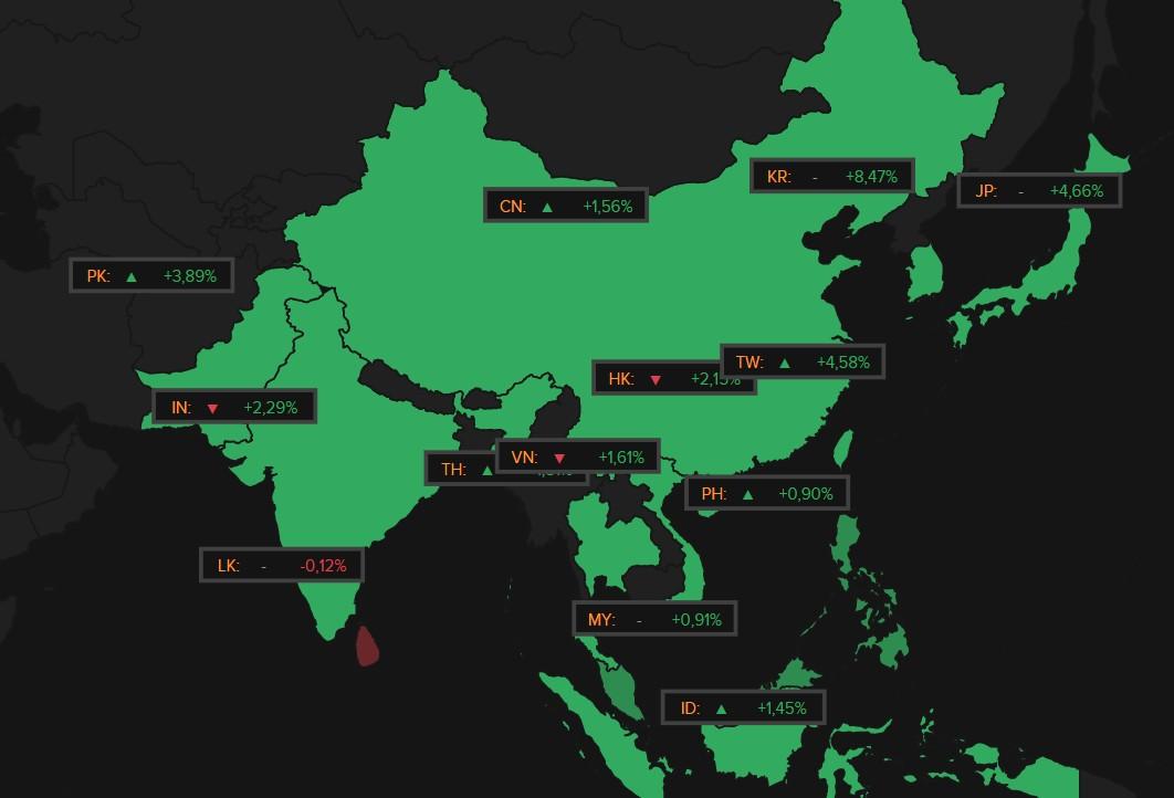 De MSCI Asia-Pacific koerste vannacht 3,1% hoger en maakte zo een einde aan een verliesreeks van vier dagen, met turbo-rollercoaster Zuid-Korea (+8%) in een glansrol. Dat is te danken aan zwaargewichten Samsung Electronics (+12%) en SK Hynix (+10%), die profiteerden van bijzonder forse exportgroei in maart (+48% op jaarbasis tot ver boven verwachting) en een erg optimistische inkoopmanagersindex (PMI). Zuid-Korea groeit het snelst in meer dan vier jaar dankzij de blijvend hoge vraag naar halfgeleiders. Op de bredere markt koersen Japan en Taiwan elk 4,7% hoger, terwijl India en China zich beperkten tot 2,3% en 1,6% winst.