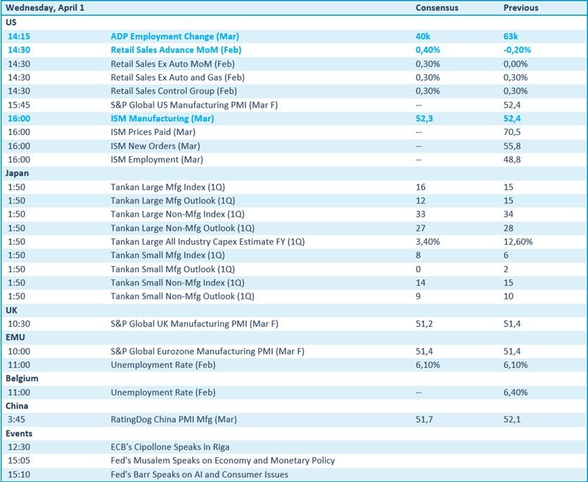 De economische kalender wordt quasi volledig gedomineerd door een update van de belangrijke sentimentsdata in de verwerkende nijverheden van China, het VK, de VS, Europa, Japan, etc.. De Japanse Tankan‑indicatoren voor zowel de grote als de kleine bedrijven in de industrie en de dienstensector zijn trouwens in bijzonder op te volgen