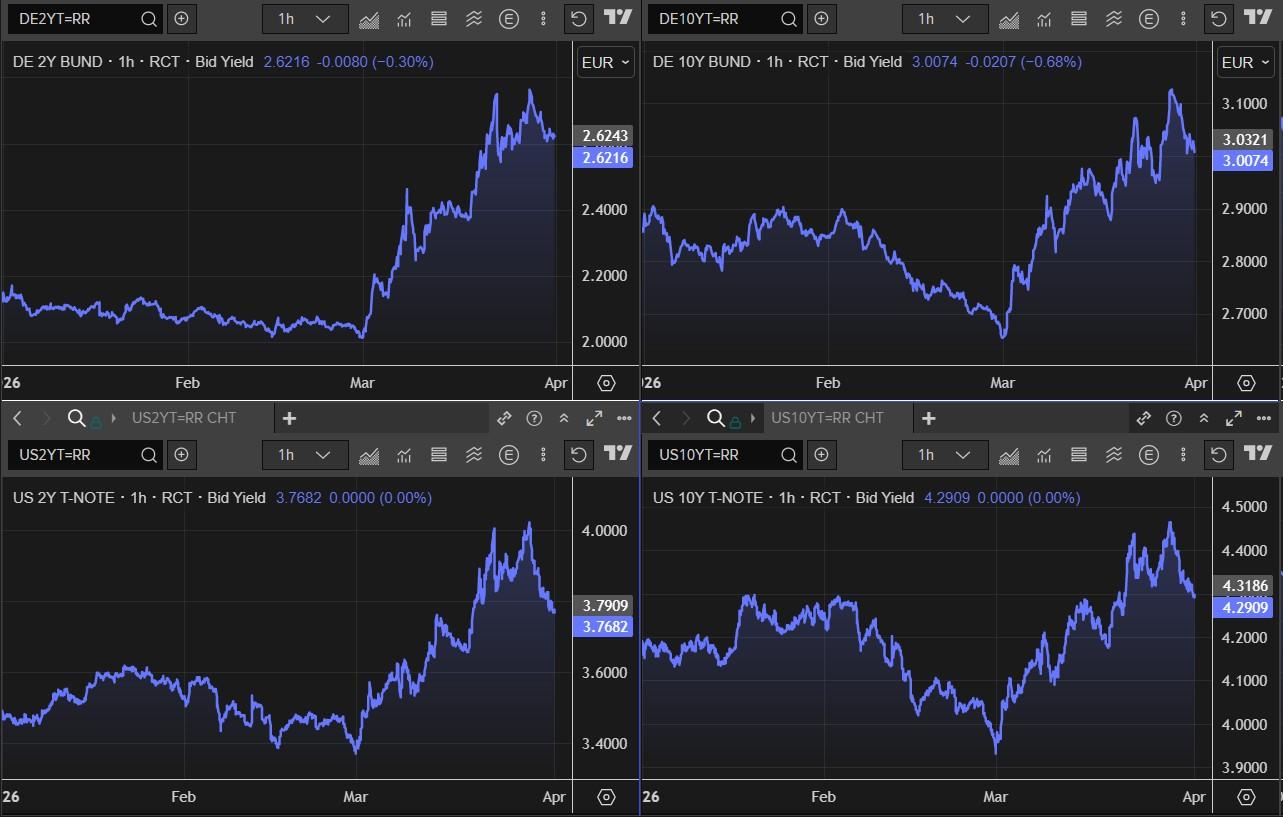 Obligaties vertaalden de bocht van Trump in hernieuwde koopinteresse voor obligaties, daags nadat de slinger al over begon te hellen naar een focus op de groeiproblematiek, eerder dan op een inflatiepiek. De kans dat de Fed de beleidsrente met 25 basispunten gaat verlagen op de vergadering van einde juli bedraagt opnieuw 32%, tegenover 7,5% eergisteren. De Amerikaanse geldmarkten geven ook zo’n 50% kans op een renteverlaging door de Fed tegen het einde van het jaar De 10-jaarsrente in de VS daalde alvast met 1,2 basispunten naar 4,3%, terwijl de Duitse rente op 3% afklokte. Ook de 2-jaarsrente daalde tot respectievelijk 3,76% en 2,62%